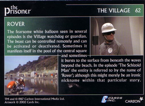 Rover is the huge sphere that goes around herding people and sometimes killing them. The original concept for Rover would have made people fall over laughing. It looked sort of like a really giant blue and white hamburger with a blue twirling light on top. The concept proved unwieldly (it was mounted on some kind of wheeled vehicle), and eventually the idea occurred of using a weather balloon.