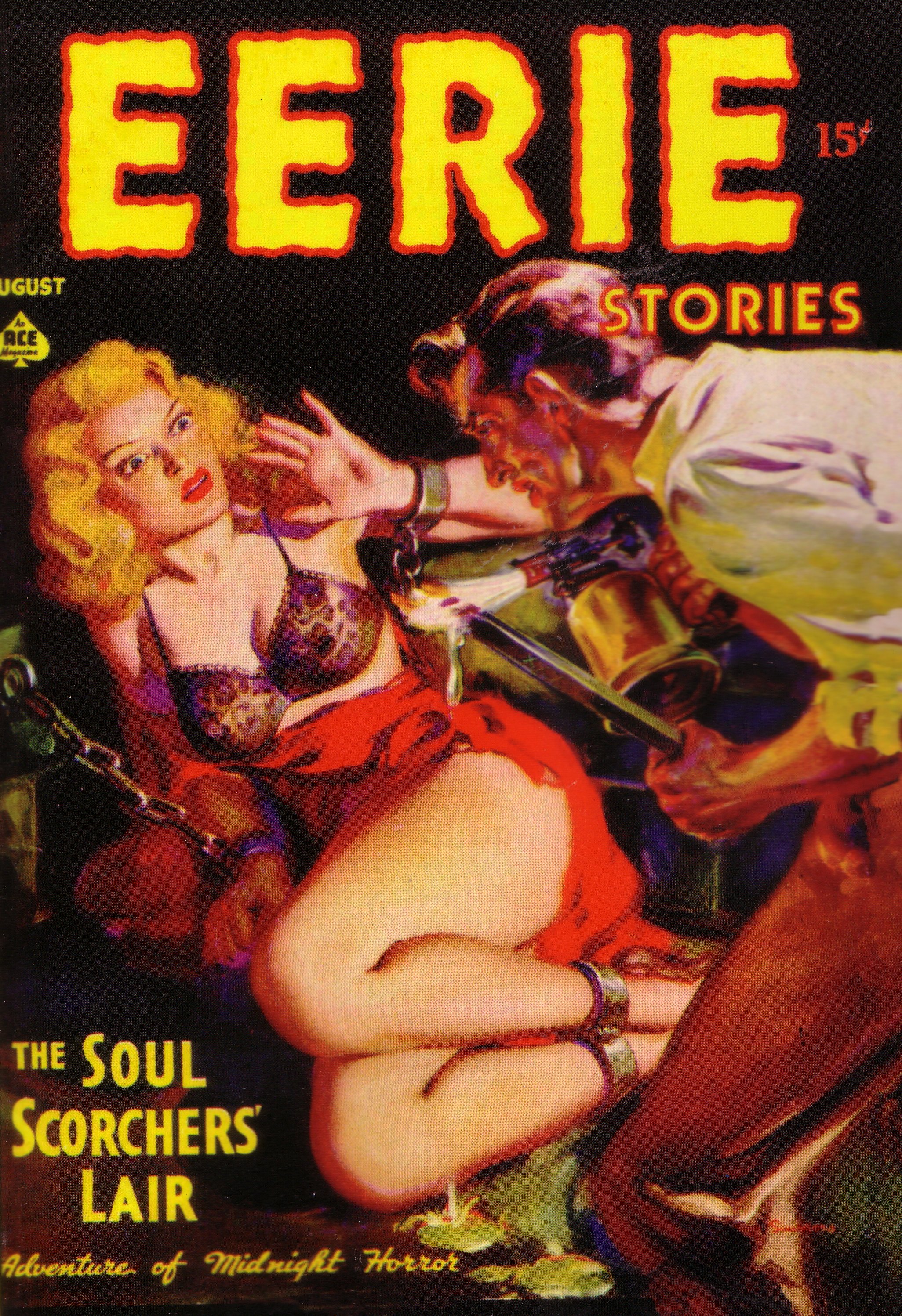 This is a typical “damsel-in-distress” cover with the guy threatening to attack the woman who is chained to he wall with her bra showing.