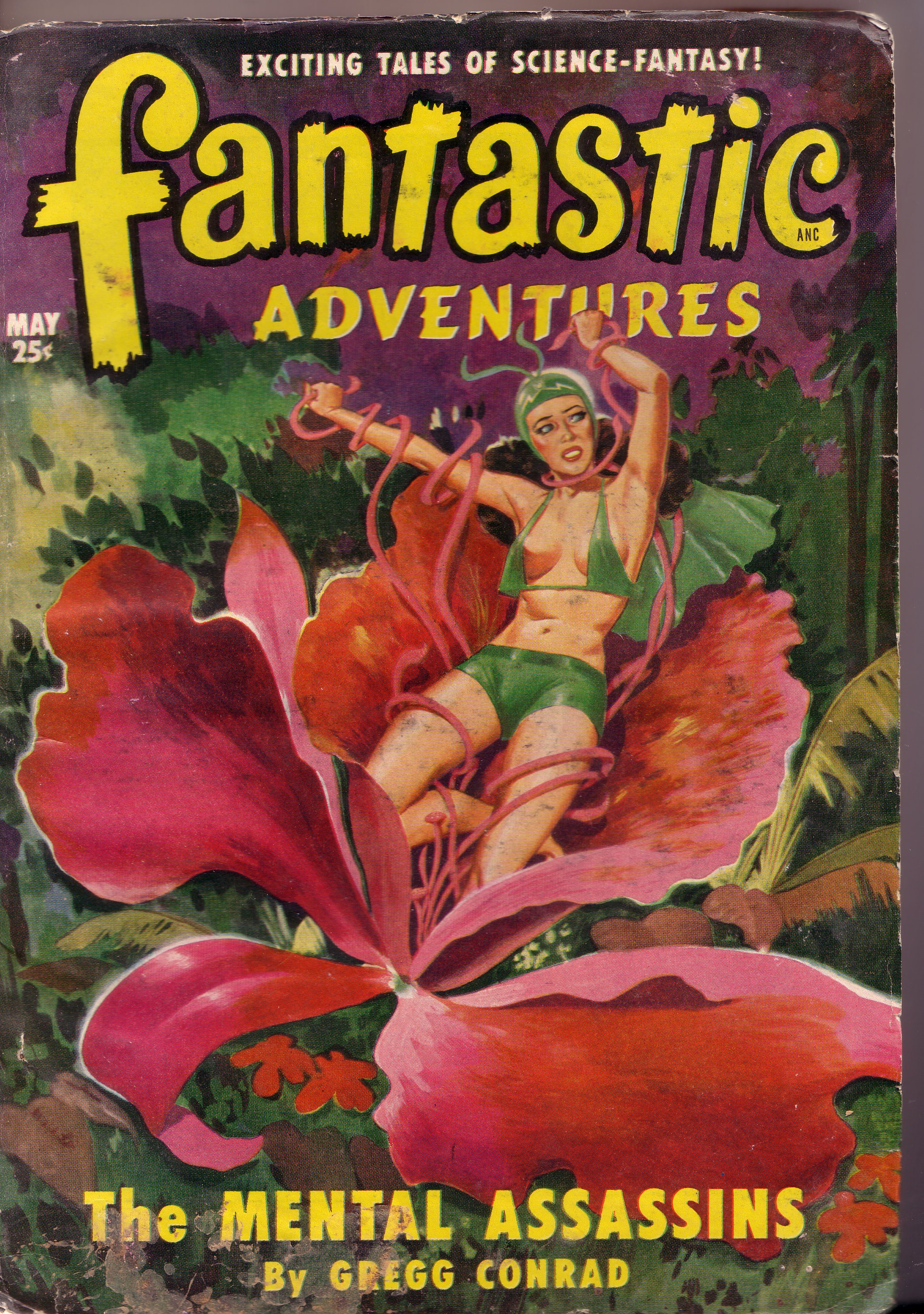 Another sexy cover, featuring a plant devouring a woman. The woman has large breasts, and her top is coming off. Her shorts are skin-tight. This type of drawing seemed to be rather popular with artists.