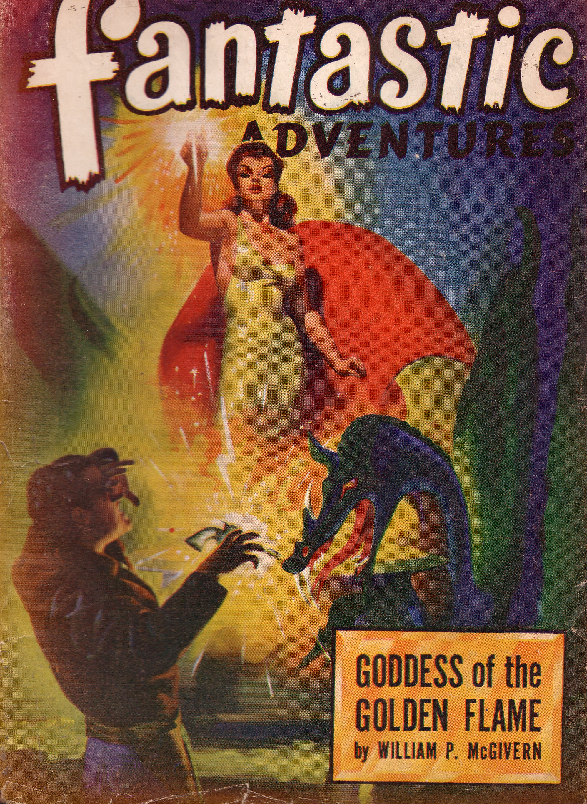 Goddess of the Golden Flame. This one has a two-page drawing at its start, not something you see that often in pulps. “Rick Mason was sent on a mission deep within the Himalayas-where he was to find a hidden secret-and a Goddess.