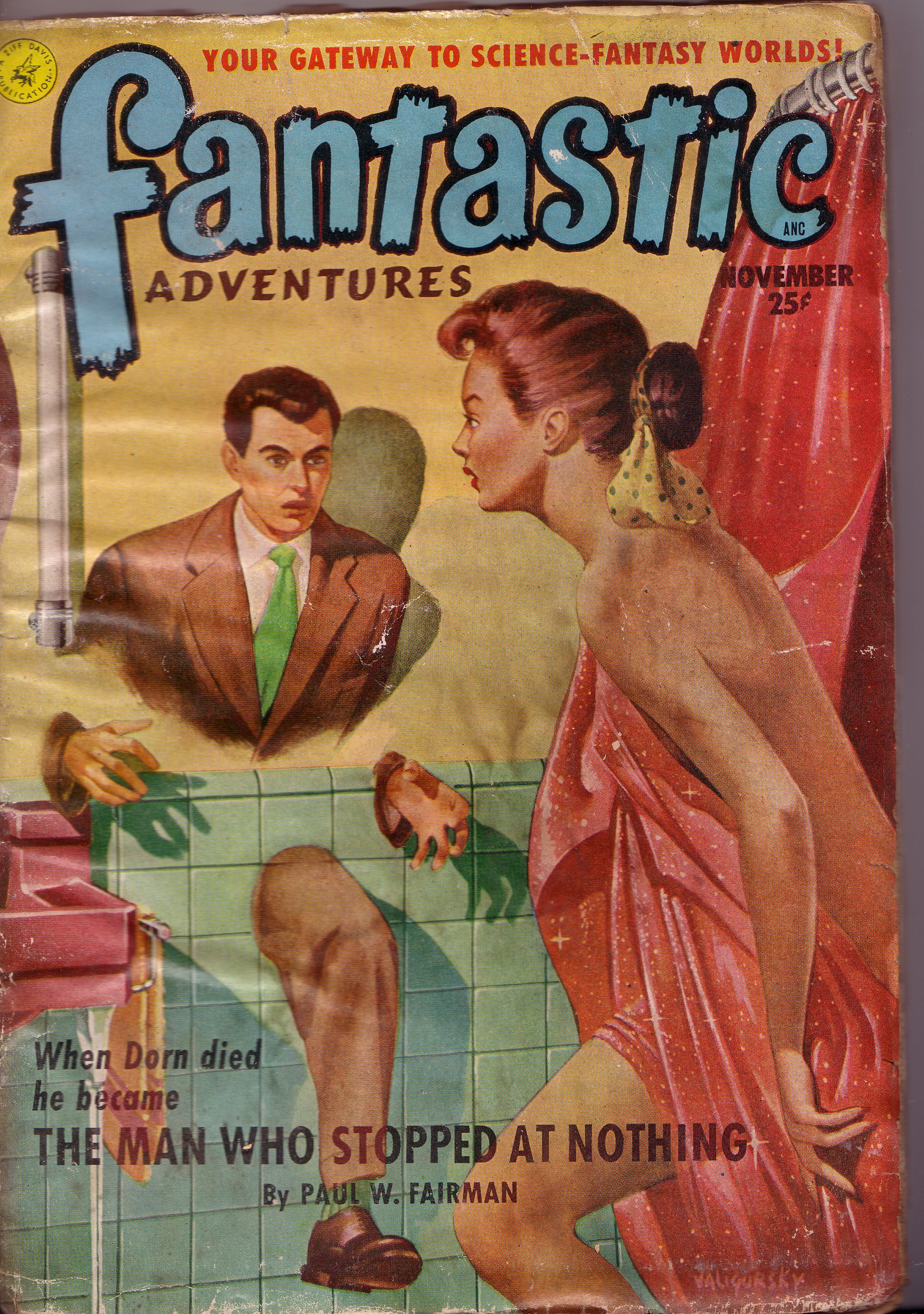 The Man Who Stopped at Nothing: “It was after Dorn was killed that he really began to enjoy living.” The story has an illustration that includes a nude woman.