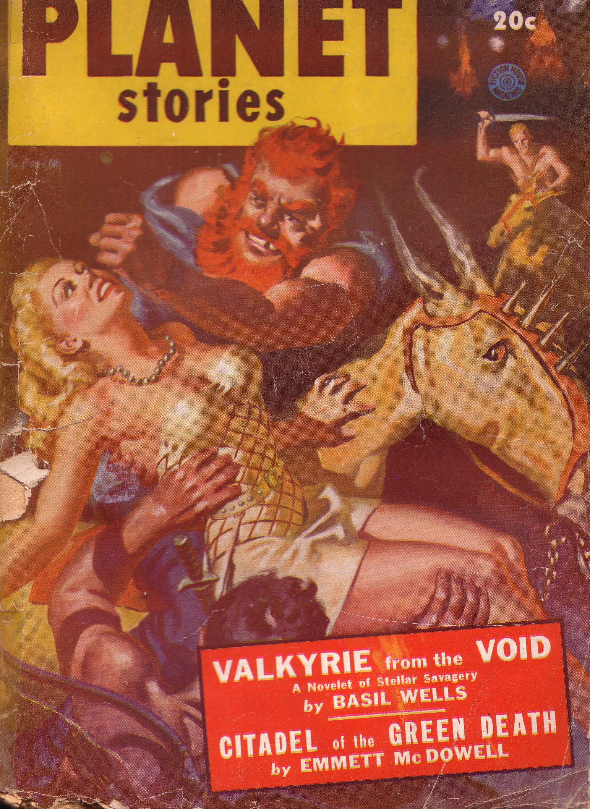Valkyrie From the Void: “Staggering under the blasting heat of a great ringed sun, she fought only to cross her savage slimy world. the lithe Priestess Yida knew not that her goal lay, bright and shining, a thousand light-years away.”