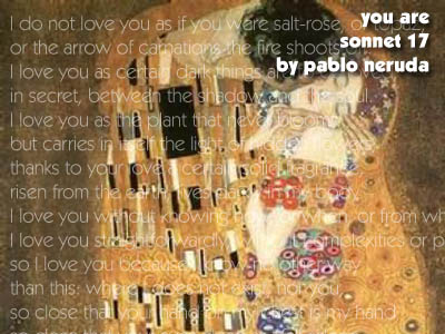 Sonnet 17 by Pablo Neruda. Aw, you're a romantic. You believe in true love and all that sort of stuff. How cute are you? To you, love is incredible and amazing.