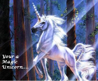 Your a magical unicorn! As all unicorns go, magic unicorns are amazing with enchantments and can perform spells and all kind of crafts. Magic Unicorns have horns that if drank from can cure blindness, and give immortality. All magical unicorns are very kind and heart-warming, but can get tempermental if a spell goes wrong. Magical Unicorns live in forests where they can practise all there magic in secret. But, if a human befreinds a magical unicorn, they have a friend for life.