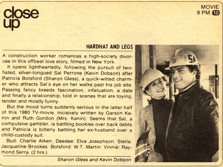 SYNOPSIS: Cheerful, fun-loving New York tale by old pros Garson Kanin and Ruth Gordon. Gless is the blueblood blonde with great legs. Dobson is the Italian construction worker intent on crossing class lines to win her. (Movies on TV & Videocassette, 1992-1993). Once they get to know one another, Kevin and Sharon help to straighten out each other's problems; his battle with bookies, her custody bout with her ex-husband. (All-Movie Guide).