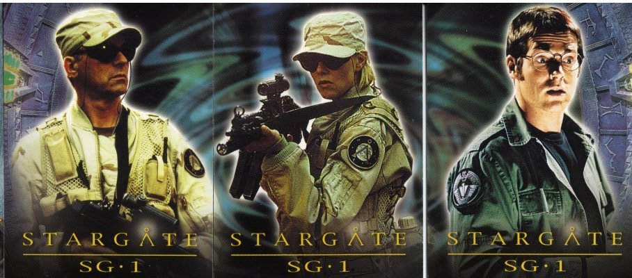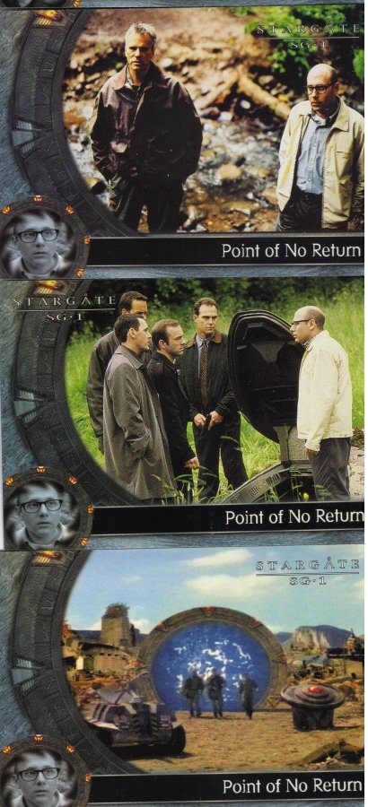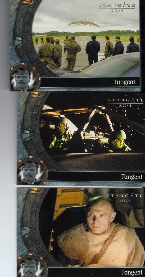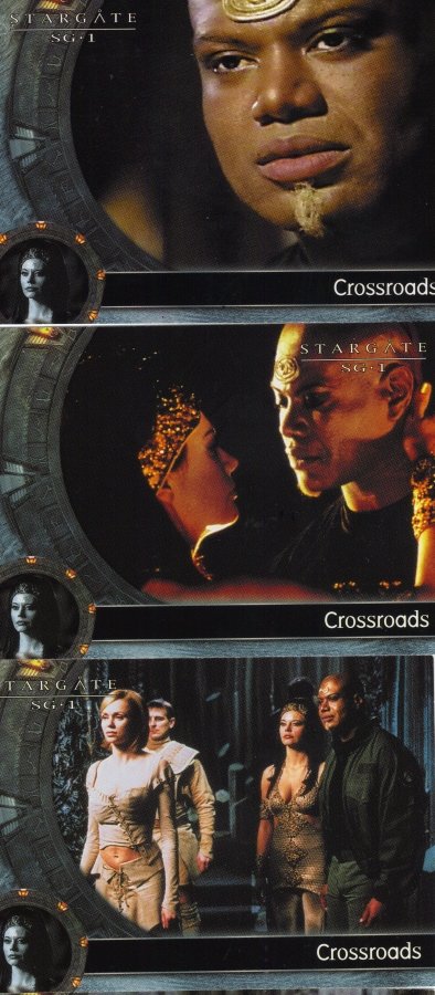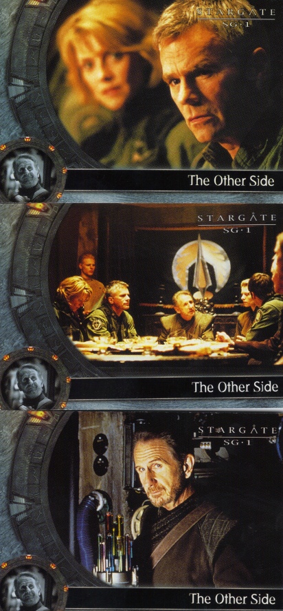 Three cards from the episode The Other Side where there's a war on another planet and SG-1 is made an offer than it almost too good to refuse.