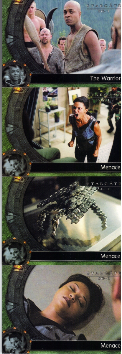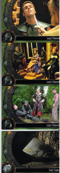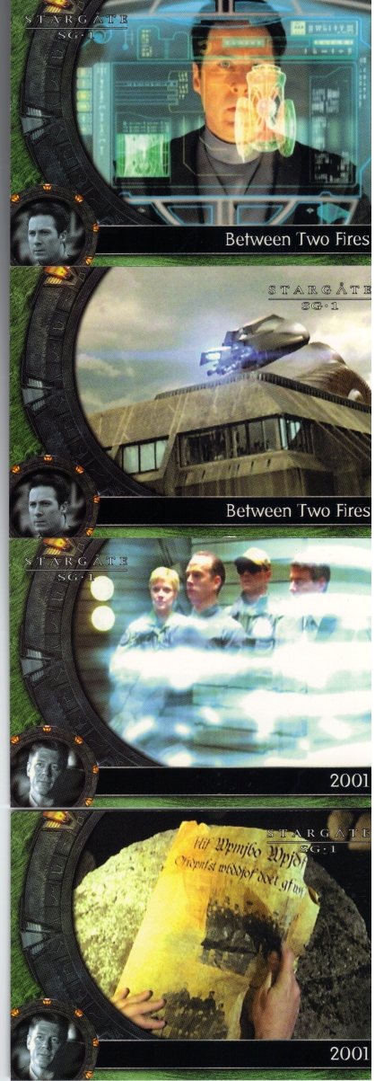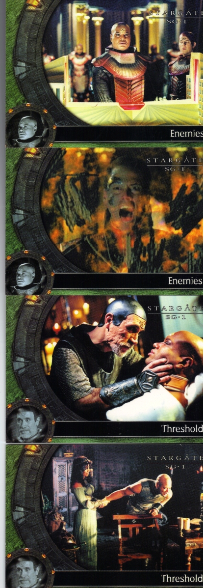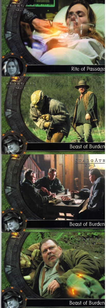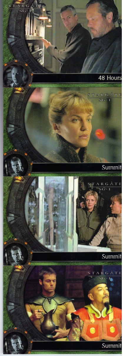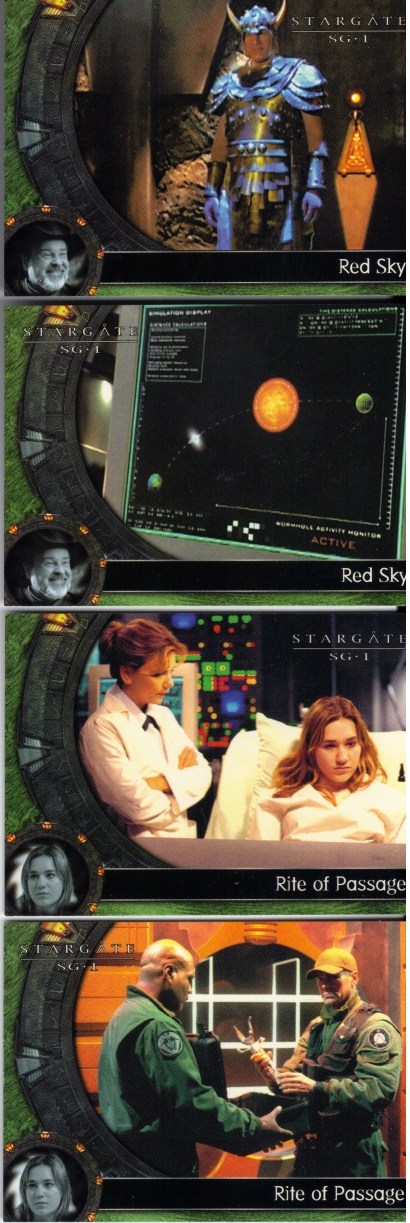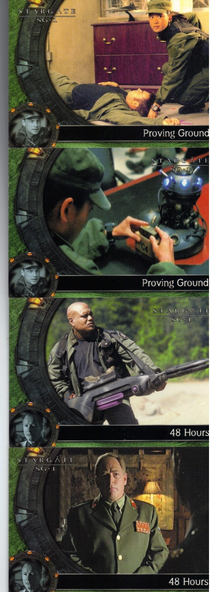 The first three cards are about an episode that's about a fictional series about a stargate program, being done by a guy from a much earlier episode. It's a good parody of the actual show. The episode after that is about O'Neill working with recruits when a foothold situation happens at the base. O'Neill is wounded, and the recruits will have to save the day.