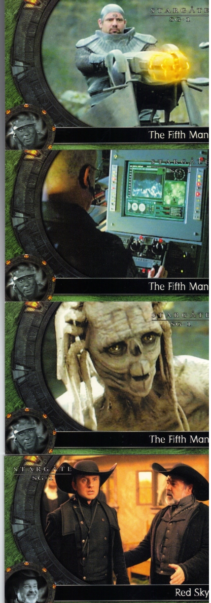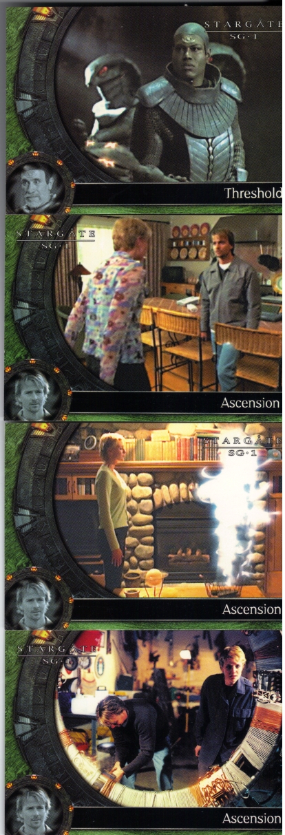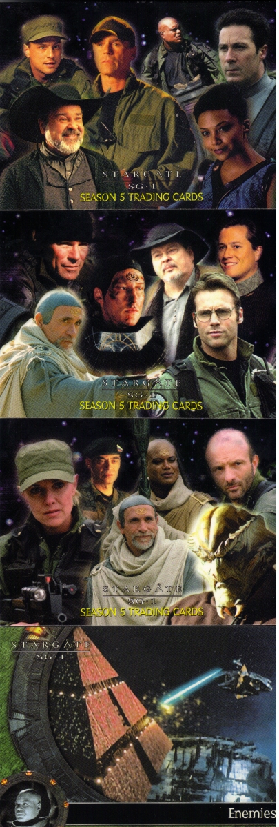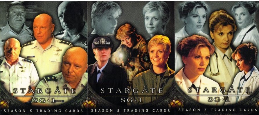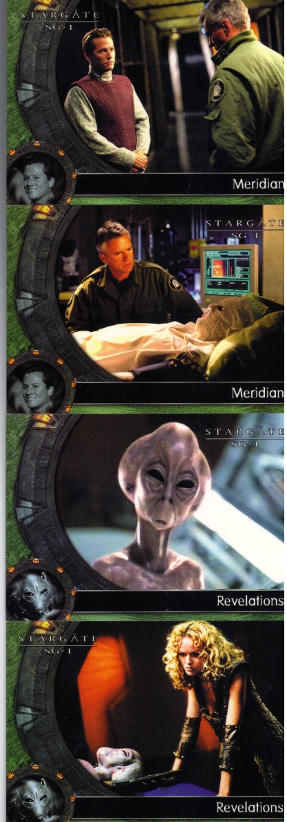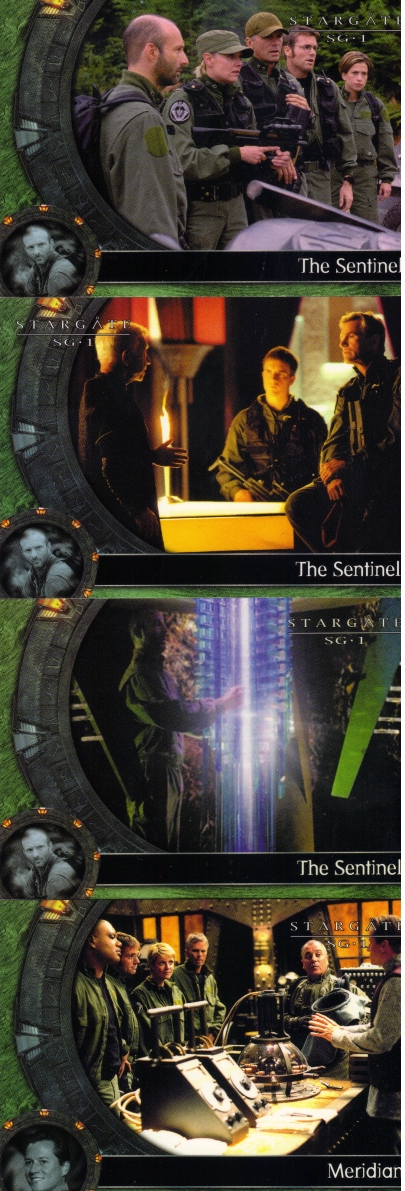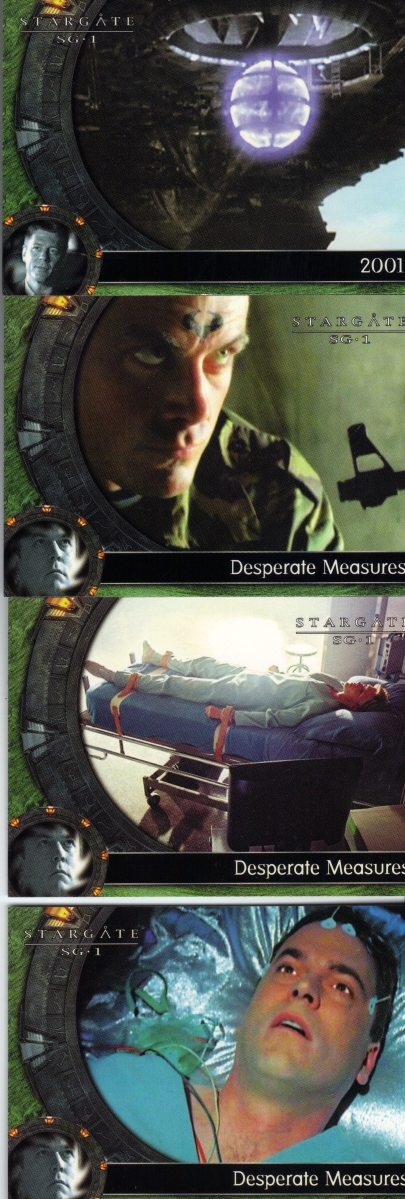 The first three cards are about an episode that's about a fictional series about a stargate program, being done by a guy from a much earlier episode. It's a good parody of the actual show. The episode after that is about O'Neill working with recruits when a foothold situation happens at the base. O'Neill is wounded, and the recruits will have to save the day.