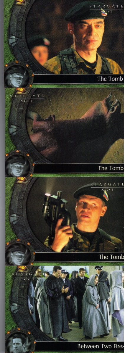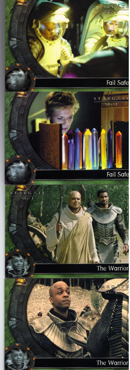 The first two cards cover more of the previous episode. The next cards cover an episode where Teal'c gets in trouble and the SG team needs the cooperation of the Russians to rescue him, but they are reluctant to help. A character that later ends up on Stargate Atlantis (and probably the single most annoying stargate character ever devised) is called in to help.