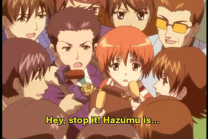 It's a week later. Hazumu has been in the hospital but will soon be released. We quickly see how odd her parents are. Their homeroom teacher helps them escape from the reporters.