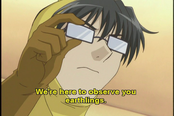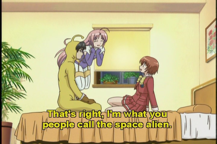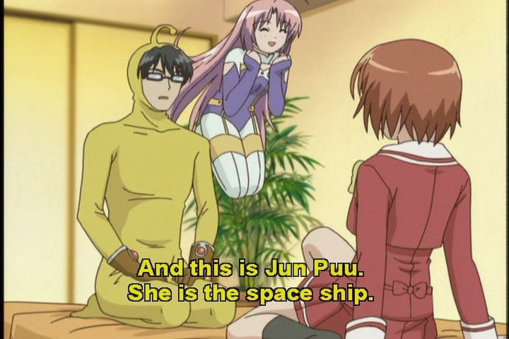 It turns out the spaceship can take on an appearance of a living thing, in this case a young girl whose name is Jan Pu. There's also another alien that has joined them to observe what is going on. There's some possible friendship problems caused by Hazumu's change from a boy to a girl.