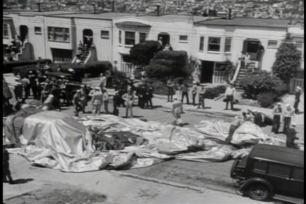The crash scene. The blimp scrapped the top of a house before settling to ground. There were no injuries among the people on the ground, fortunately.