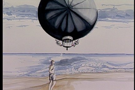 A description of the scene where a swimmer saw the blimp approaching the land.