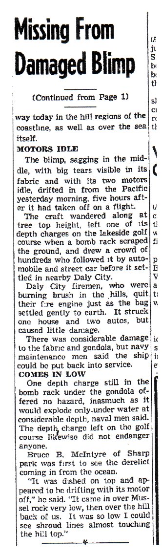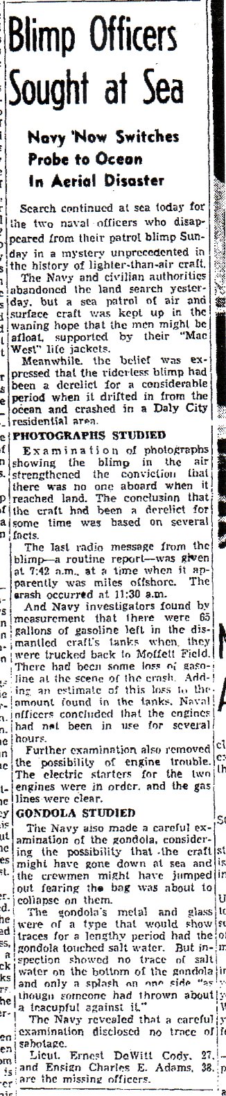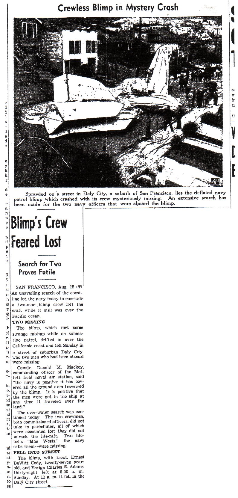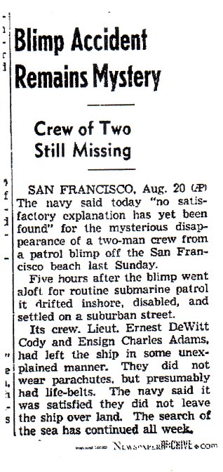 The Navy's explanation was that something went wrong, one guy opened the door to look out and see what was happening, and somehow both men fell out of the blimp and presumably were killed upon impacting the water.