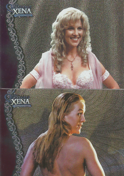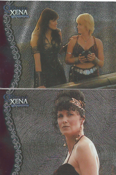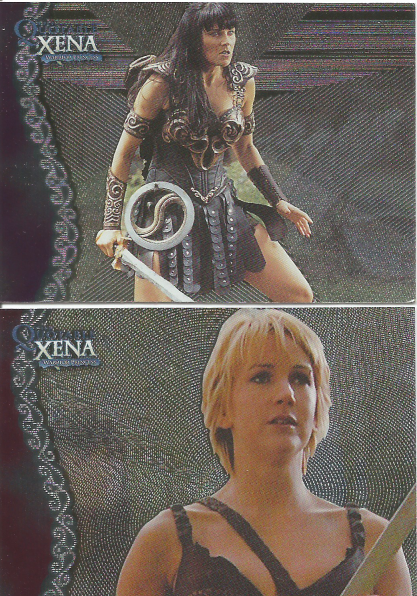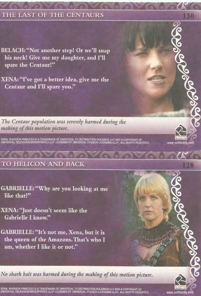 There are 135 cards in this set and in my opinion it is the best of all the Xena card sets. The front is the shiny chrome type and the photograph image on the front of the cards is very clear. The back of the cards have the quotes and some humor. You can get a set on Ebay, usually, and it's definitely worth getting.