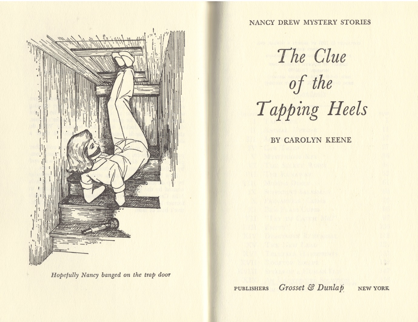 Nancy visits Bealing at Carter's and finds out Carter has been sending money to a girl named Beverly Barrett. Bealing also mentions the tapping sound. Carter gives Nancy a Persian kitten. Mr. Drew wants Nancy to go to New York, and she wants to check on the girl that Carter had been sending money to. They get on a train and meet Horace who is pushing to get a play accepted. He wants the leading role to go to the girl Nancy is checking up on.