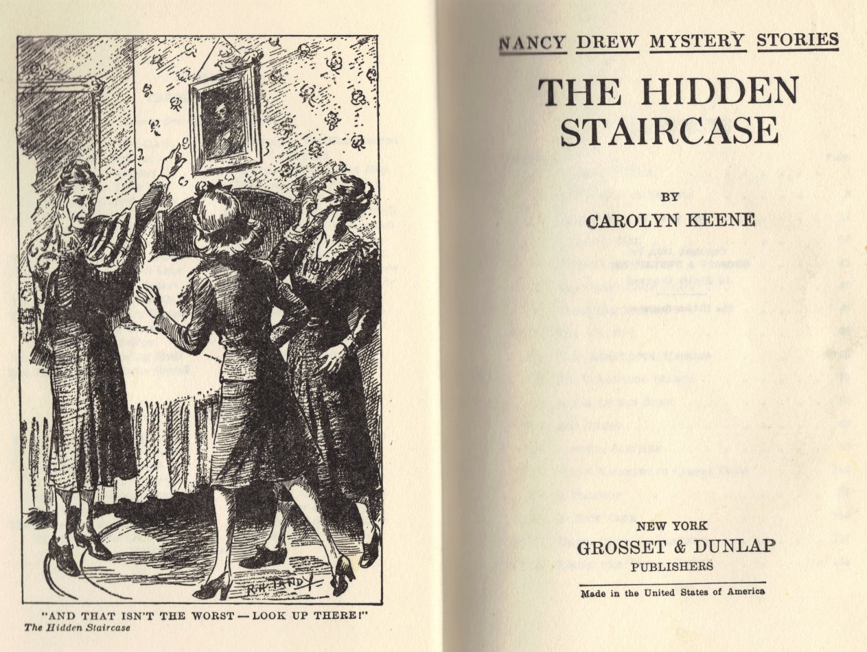 1930: Some dresses have been stolen, and two canaries make their appearance. (The bird involvement is an owl in the newer version). One of the women reveals that Gombet had wanted to buy the house. He had threatened them when they said they would not sell the house to him. Nancy worries about her father.