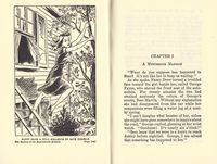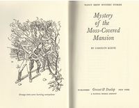 She points out that there were two types of changes to this particular volume. The original title is The Mystery of the Moss-Covered Mansion. The revised title drops the 'The' from the front. Secondly, she points out that the text change is major.