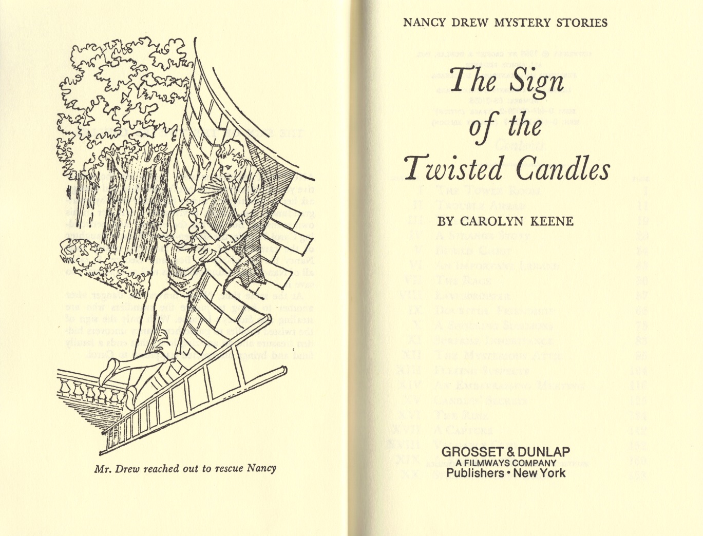1932: The young girls name is Sadie Whipple. Her foster parents run the tea room. Sadie refers to the old man upstairs as Mr. Sydney. The name of the nasty man is Semitt. Nancy goes to the tower room when the guy refers to Nancy as Jenny (his deceased wife.)