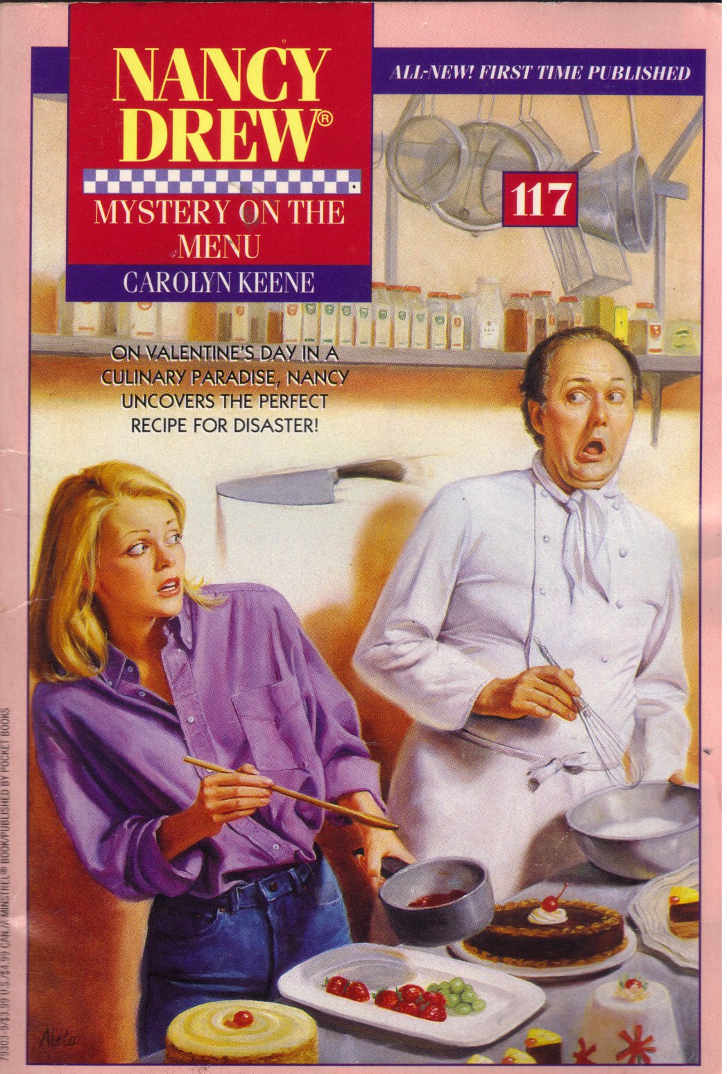Nancy is 18 in the book and goes to a culinary school for one week with her friends George and Bess. There is some cooking, of course, but the main part is the mystery of who is attacking the cooks? Nancy almost gets knifed (and she does get knocked out) A chef gets poisoned and other things happen. Nancy also ends up investigating some stolen recipes, but the person causing all the fuss is someone with a major motive to ruin the school.
