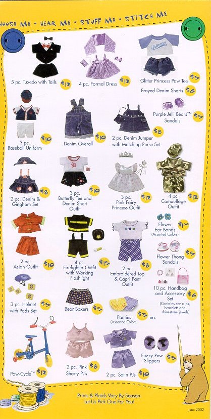 Here is the front of the BABW brochure, many of the choices of animals, and a small sampling of the clothes and accessories that are available, with prices (as of June 2002): (click on the pictures to see them very much LARGER!)