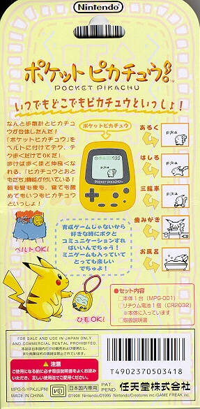 Pikachu is the main (non-human) character in the wildly popular anime series, "Pokemon" ("Pocket Monsters"). Now you can raise Pikachu as a virtual pet; plus he counts your steps for you when you walk, jog, or run! In order to help Pikachu grow and thrive, you need to earn watts (he *is* a Denki Nezumi (Electric Mouse)) to give him as gifts. You do this by the aforementioned walking, jogging, or running (or in times of desperation or laziness, shaking the case up and down repeatedly or swinging it like a pendulum). You can take a chance and earn more watts by playing a slot machine game. The more watts (energy) you can give him, the friendlier towards you he will be. You do not need to do anything else for Pikachu: he has a regular schedule of many cute activities that you get to peek in on: eating, playing, reading, bathing, and *many* more!